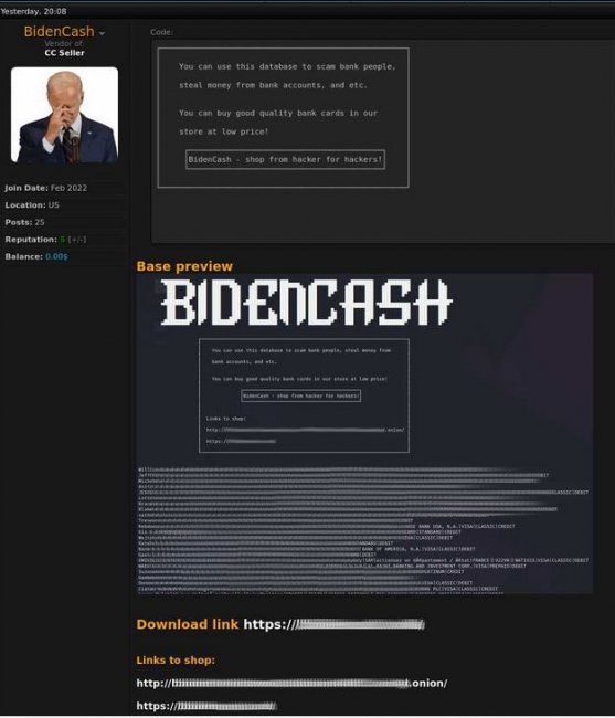 Исследователи обнаружили новый кардерский сайт BidenCash, операторы которого пытаются получить известность, публикуя данные кредитных карт и информацию об их владельцах бесплатно или почти бесплатно.