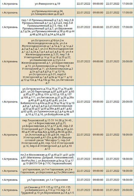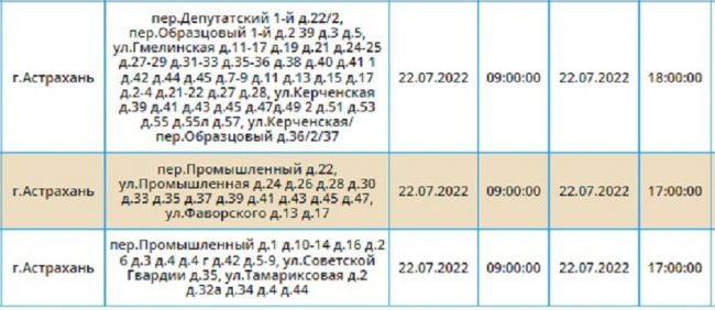 Так, в Астрахани 22 июля с 10.00 до 17.00 свет отключат в домах по ул. В. Барсовой, 15к4, 17к1, 15к1, 15к3, 13к2 ст.1, а также в других зданиях учреждений, расположенных по этой улице.