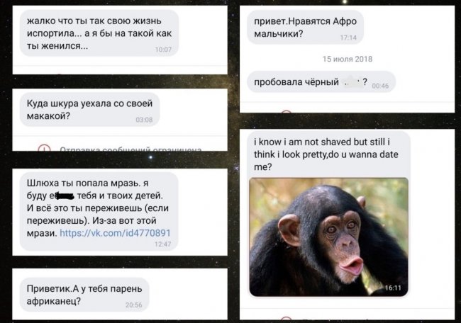 Сегодня самые активные расисты – это те, кому 25-40 лет. Это люди, которые не состоялись в жизни, ни разу не выезжали за границу, живут в своем замкнутом мире. Весь их кругозор ограничен сетью «ВКонтакте». Там есть закрытые группы – «Чернильницы», которые насчитывают тысячи участников. Они выискивают таких людей, как мы – русских парней и девушек, которые встречаются с африканцами. Когда мне стали поступать угрозы, я попыталась узнать, кто эти люди и как они узнают о нас. Я зарегистрировалась через чужой аккаунт. Там творится невероятное! Они выкладывают у себя на стену наши фотографии, наши телефоны, а, если находят, то и адрес. Они начинают преследовать – в день приходит по пять-шесть сообщений. Если я начинала получать сообщения, значит меня выложили на стене.