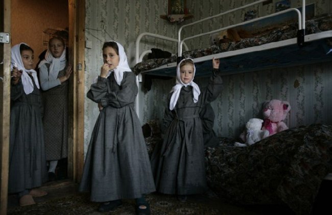 В классах монастыря обычно училось по 5–6 детей, всего их в приюте находится человек 30–40 максимум. Система устроена так, что взрослые живут отдельно, в домах или в бараках. В одном городе — вообще подвал, где одни только нары из грубых досок двумя ярусами. Монахам выделяются кельи, чтобы они могли молиться, поститься, слушать радио «Радонеж» и заниматься своими делами. Детей селят в отдельном корпусе, коттедже, бараке — в зависимости от инфраструктуры монастыря. За ними следит воспитатель, как правило — монахиня, обычно одна. Все бытовые нужды лежат на детях: тот, кто постарше, занимается стиркой, кто помладше — драит унитазы и так далее. Разве что в трапезной, если там работают взрослые, дети только едят.