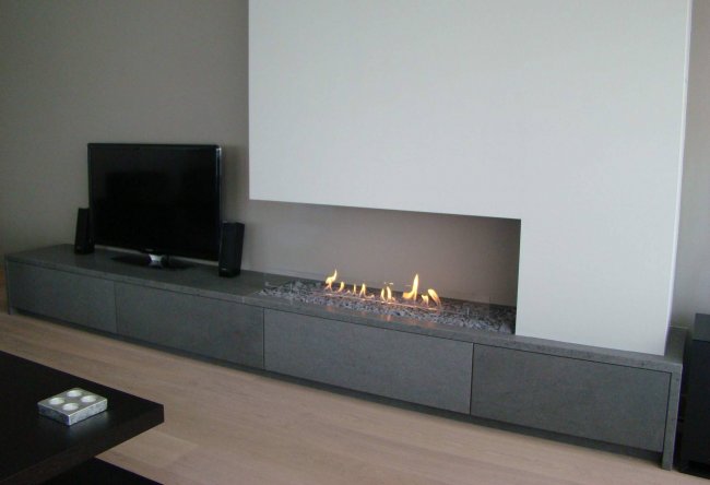 Эффектнее всего смотрится с панорамной открытой или закрытой топкой, позволяющей любоваться горящим огнем со всех сторон.
