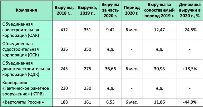 Есть в России и другое машиностроение: Объединенная авиастроительная корпорация, Объединенная судостроительная корпорация, Объединенная двигателестроительная корпорация, корпорация «Тактическое ракетное вооружение», «Вертолеты России». Каждый концерн из этой пятерки по выручке входит в первую сотню российских компаний, а если взять их суммарный объем продаж, то из российских производственных компаний больше только у «Газпрома», «Роснефти», «Лукойла» и «Сургутнефтегаза». Однако если топливные гиганты для государства служат дойными коровами, то для предприятий оборонно-промышленного комплекса (ОПК), наоборот, главным источником денег является госзаказ. Несколько лет на этой волне они переживали бум, но сейчас, в 2020, нельзя сказать, что динамика их доходов существенно лучше, чем в среднем по стране (см. таблицу).