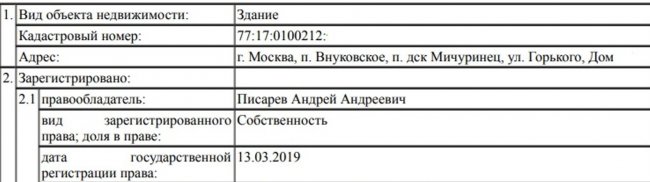Также у The Insider есть выписка из Росреестра, согласно которой Писарев владеет четырехэтажным домом в ДСК «Мичуринец» в Переделкино. Площадь построенного в 2019 году здания 1064 м².