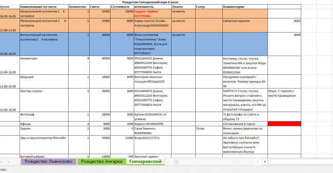 Так, например, согласно смете по Гончаровскому парку, на плату музыкальным коллективам было выделено 70 тысяч рублей, реально же исполнители — две кавер-группы по 4 человека — получили всего 18,8 тысячи рублей. На четверых аниматоров, работавших там же в новогоднюю ночь, выделялось 40 тысяч рублей. На самом деле их зарплата составила 9,6 тысячи рублей на всех. А ведущему праздника вместо 10 тысяч, заплатили только 6.