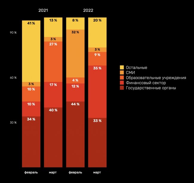 - В марте 2022 года самая большая нагрузка пришлась на финансовые организации, в первую очередь на банки: их доля в общем объеме атак выросла в три раза — до 35%.