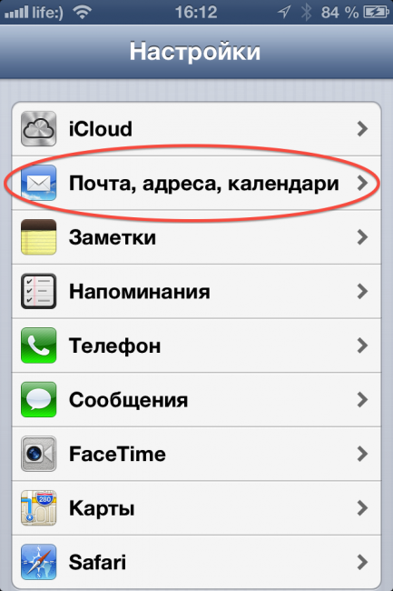 - для начала зайдите в настройки на вашем устройстве, а затем опуститесь в самый низ, до вкладки «почта, адреса, календаря»;