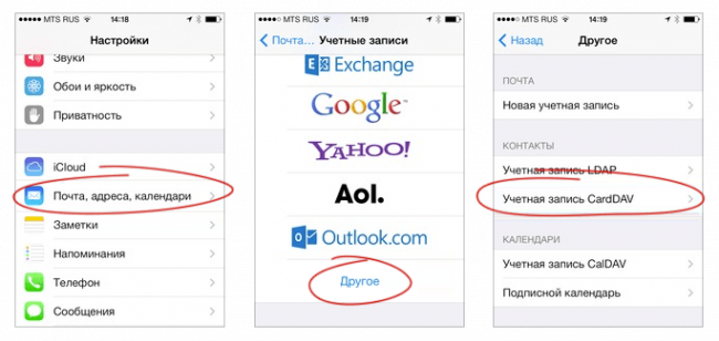 - затем, выберите пункт «Учетная запись CardDAV» и заполните все данные собственной учетной записи. Для того, чтобы правильно заполнить форму, воспользуйтесь следующим примером: