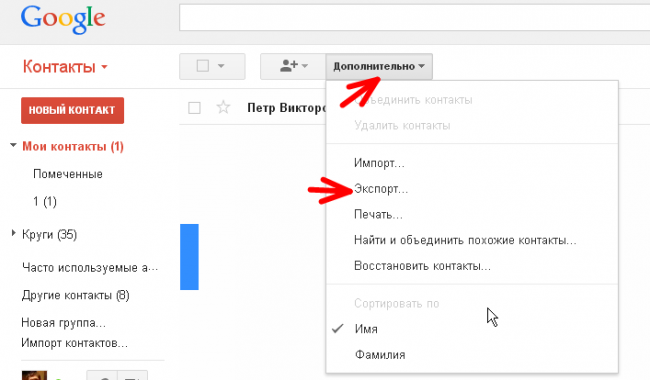 - после того как вам откроется дополнительное меню, выберите «Экспорт» «Все контакты» «Формат вКард» и нажмите кнопку «Экспорт»;