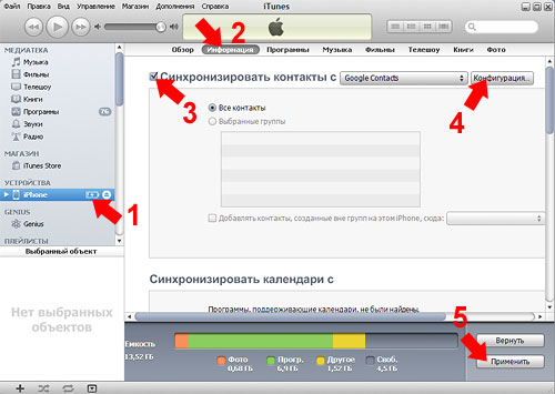 Перенос контактной информации с помощью Itunes 11 и более новых версий: