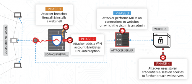 Получение доступа к Sophos Firewall было лишь первым этапом компрометации, позволявшим выполнить MitM-атаку (путем изменения ответов DNS для определенных сайтов, управляемых компанией-жертвой).