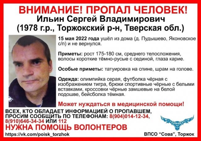 В Тверской области ведется розыск Сергея Ильина, жителя деревни Пудышево Торжокского района. Как сообщает ВПСО «Сова», 15 мая мужчина ушел из дома и пропал.