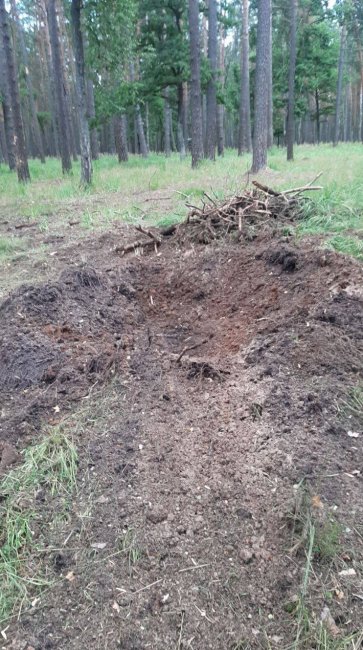 Воронка и осколок минометной мины на месте ее попадания в Белой Березке. Фото из Телеграм-канала Александра Богомаза.