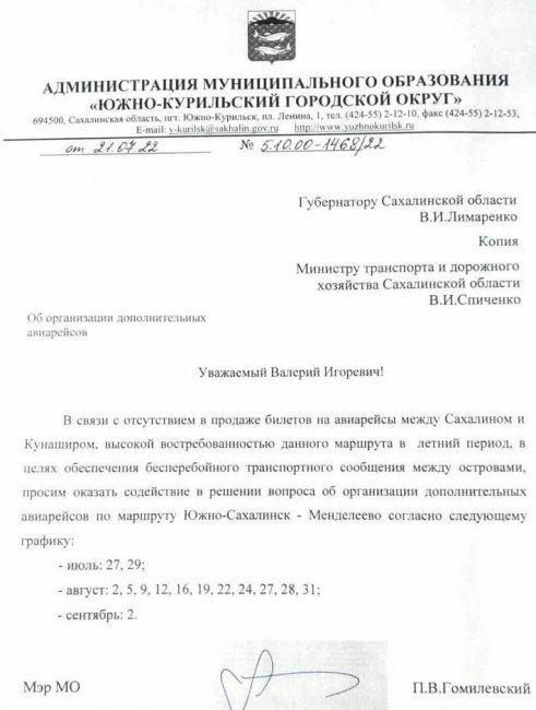 «В летний сезон этого года ощущается наплыв туристов на Курильские острова из разных регионов России. И хотя на курильском направлении уже ходит три пассажирских теплохода «Игорь Фархутдинов», «Павел Леонов» и «Адмирал Невельской», а компания «Аврора» осуществляет ежедневные авиарейсы на Кунашир и Итуруп, толпы желающих не могут попасть на острова», — объяснил Павел Гомилевский в своем Telegram-канале.