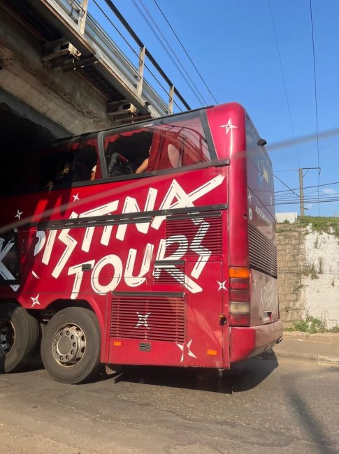 Водитель двухэтажного туристического автобуса не рассчитал высоту своего транспортного средства и не соотнес ее с высотой моста. Поэтому застрял под железнодорожной эстакадой у Шинного завода.