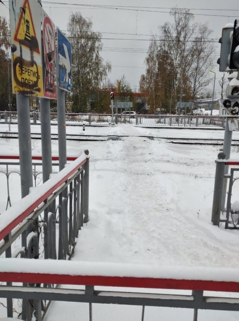Железнодорожный переезд в Петрозаводске покрылся снегом