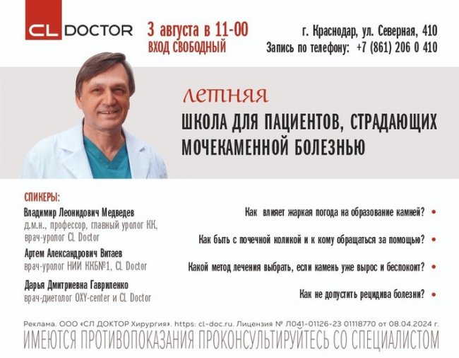 В кубанской столице 3 августа в клинике CL Doctor на улице Северная, 410 состоится первое занятие летней Школы для пациентов. Специалисты расскажут о профилактике и лечении мочекаменной болезни.