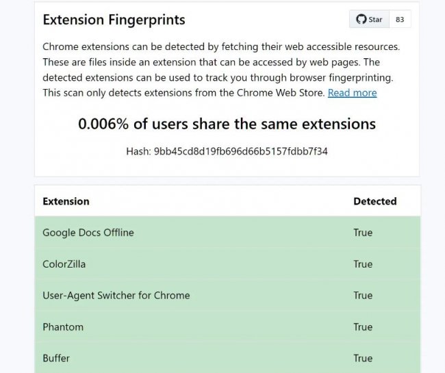 «Наличие 3+ обнаруживаемых расширений, похоже, всегда делает ваш профиль весьма уникальным», — предупреждает исследователь.