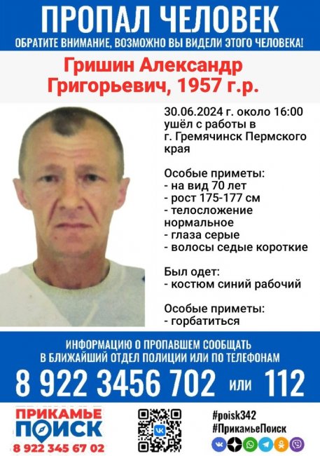 В Орловской области разыскивают жителя Пермского края. 67-летний Александр Григорьевич Гришин ушёл с работы около 16 часов 30 июня этого года в городе Гремячинск Пермского края и до сих пор ничего неизвестно о его местонахождении. Об этом сообщается в группе «Поисковый отряд ПрикамьеПоиск» в социальной сети ВКонтакте.