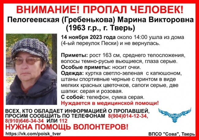 В Твери пропала Марина Пелогеевская. Как сообщает ВПСО «Сова», 14 ноября около 14 часов женщина ушла из дома и пропала.
