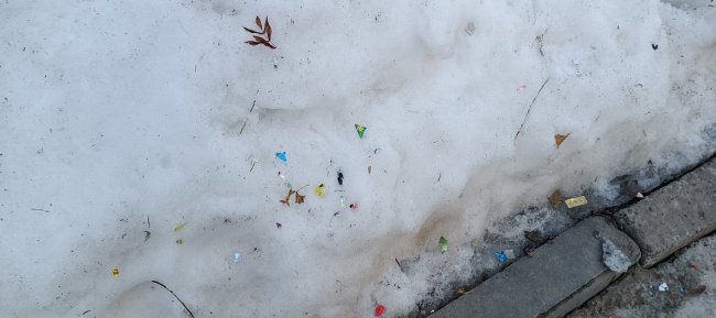 Вредный для экологии пластиковый сор, остающийся от хлопушек, вылез из-под снега в городе во всех районах. Если картонные тубы от фейерверков разойдутся, то конфетти останутся надолго, ведь они не разлагаются.