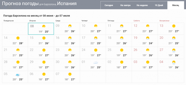 В июне начинается туристический сезон, пляжи заполняются туристами. Первый месяц – прекрасная пора для отдыха. Еще нет изматывающей жары, и воздух в полдень прогрет до +23..+25 °C. Ночи в Барселоне довольно прохладные, +15 °C. Температура воды достигает +21 °C. В начале июля становится уже гораздо жарче. В полдень столбик термометра может доходить до +30…+35 °C, но в основном не выше +28 °C. Море становится теплее, +24 °C.