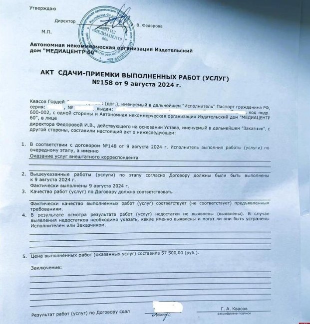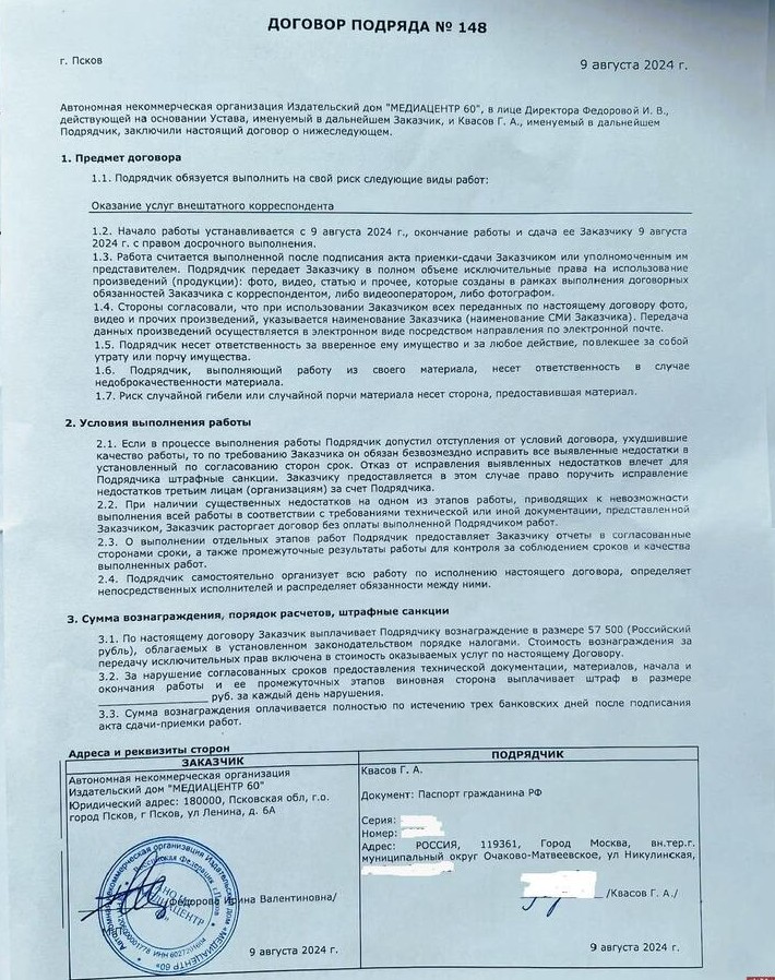 Договор подписан, работа начата, работа завершена, акт закрыт – все в один и тот же день, 9 августа 2024 года. Несколько часов работы, и в кармане подающего надежды внештатного журналиста – 50 тысяч рублей.